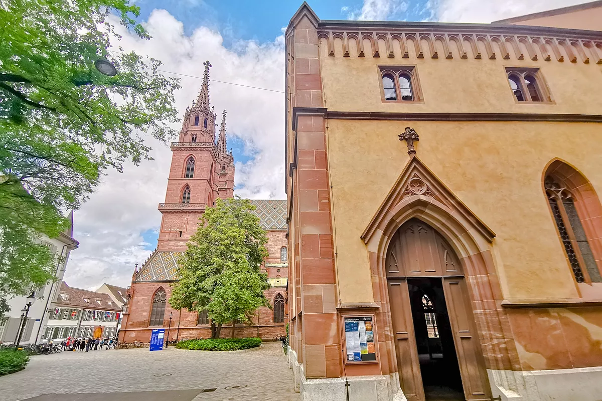 巴塞爾大教堂是老城最重要的建筑。它有著紅色外墻,羅曼式正門和兩座高聳的哥特式塔樓。大教堂建于1019年,但羅曼式建筑的教堂毀于1356年巴塞爾的大地震,之后重建直到1500年新的建筑才完成。所以現(xiàn)在看到的巴塞爾大教堂是羅曼式和哥德式混搭的建筑。她不僅是巴塞爾的地標,著名的人文主義思想家伊拉斯謨也葬在這里。