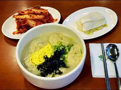 餃子湯是寒冷的冬天韓國人喜愛的美味中的美味,吃一碗暖到了心里。將幾個肉菜餡的大餃子放入湯里煮好后即成餃子湯,一般還會放入糕,春節(jié)也常吃。近來除了豬肉或牛肉的饅頭餡外,放入野雞肉做成的餃子湯也很好吃,餃子皮還可以摻入蔬菜做成粉紅色或黃色。一年四季中特別是冬天餃子湯吃得最多,和泡菜一起吃更可口。一碗一般4,000~6,000韓元,各地小店不同。