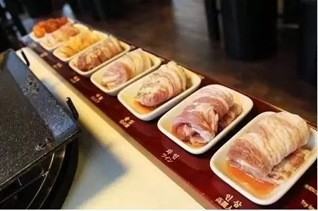 這家韓國八色烤肉店,入座之后,服務(wù)員會端來盛著八味豬五花的長方形瓷盤。這八味豬五花是用不同種腌料腌制而成,并按味道由輕到重依次擺放為人參味、原味、紅酒味、松葉味、香草味、咖喱味、大醬味以及韓式辣醬味,烤肉的時候一定要按照由輕到重的口味來吃,這樣才能細細地品出每一味豬五花的獨特之處。