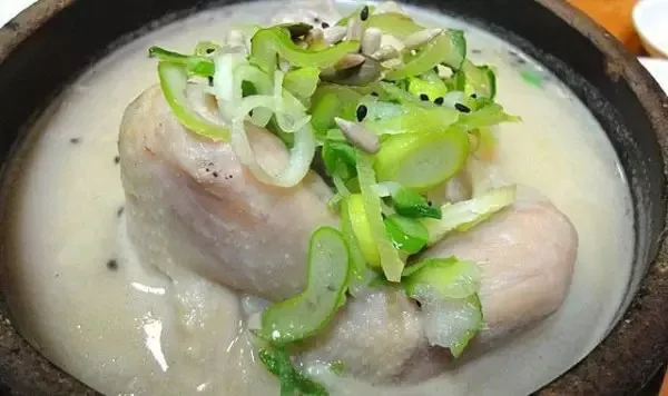 參雞湯是用童子雞,在腹中塞入糯米和高麗參燉成的濃湯。吃的時候主要是喝湯,雞肉已經(jīng)燉到爛熟,只能用來稍微下飯。不同于我們的人參燉雞,高麗參原本性涼,尤其適合春夏兩季食用。