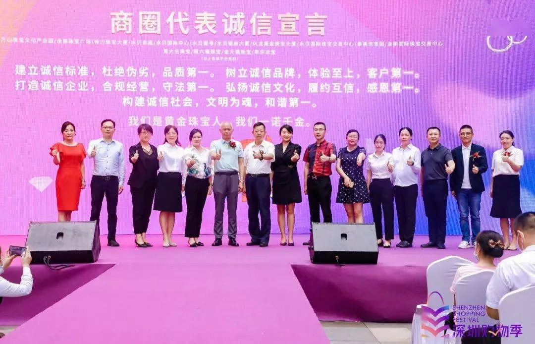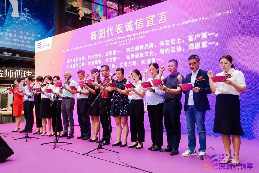 啟動(dòng)儀式上,水貝萬(wàn)山珠寶文化產(chǎn)業(yè)園總經(jīng)理陳曄平、金展珠寶廣場(chǎng)招商運(yùn)營(yíng)總監(jiān)王琳琳、特力珠寶大廈運(yùn)營(yíng)總經(jīng)理崔戰(zhàn)紅、水貝金座運(yùn)營(yíng)中心總監(jiān)趙麗、水貝國(guó)際中心運(yùn)營(yíng)總監(jiān)廖燦榮、深圳市水貝壹號(hào)投資發(fā)展有限公司副總經(jīng)理石妍、興龍黃金珠寶大廈總經(jīng)理湯文平、水貝國(guó)際珠寶交易中心總監(jiān)劉婷、泰美珠寶園招商經(jīng)理鄧晶晶、金麗國(guó)際珠寶交易中心副總經(jīng)理陳春竹、水貝銀座大廈常務(wù)副總楊曉鵬等交易中心代表,以及周六福珠寶總經(jīng)理謝明育、周大生珠寶行政副總經(jīng)理周洪生、金大福珠寶副總裁丘航、萃華珠寶總經(jīng)理助理郭裕華等珠寶品牌代表一同上臺(tái)宣誓,表達(dá)展示特色、推廣品牌、促進(jìn)消費(fèi)、助推增長(zhǎng)的決心。