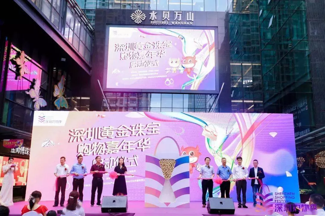 啟動(dòng)儀式現(xiàn)場(chǎng), 深圳市商務(wù)局流通市場(chǎng)處副處長(zhǎng)劉勉、深圳市羅湖區(qū)商務(wù)局副局長(zhǎng)馬瑛、深圳市翠竹街道二級(jí)調(diào)研員林百全、深圳市羅湖區(qū)商務(wù)局工貿(mào)科科長(zhǎng)胡國(guó)清、深圳市黃金珠寶首飾行業(yè)協(xié)會(huì)會(huì)長(zhǎng)黃志勇、執(zhí)行會(huì)長(zhǎng)楊紹武、水貝萬(wàn)山珠寶文化產(chǎn)業(yè)園執(zhí)行董事劉佐忠、周大生珠寶行政副總經(jīng)理周洪生、周六福珠寶總經(jīng)理謝明育等諸多領(lǐng)導(dǎo)嘉賓,以及各大交易中心、珠寶品牌商以及媒體代表?yè)苋叩綀?chǎng)、共襄盛舉。