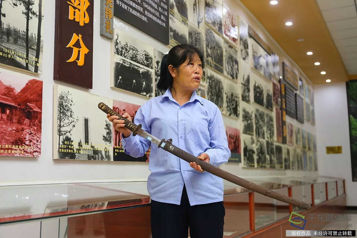 一枚王八形的地雷手榴彈、兩把繳獲的日軍指揮刀、刻有平谷555名抗日戰(zhàn)爭革命烈士英名錄……訴說著“鐵北寨、銅南山、打不垮的魚子山”的革命精神。圖為講解員張玉霞展示李德成和陳洪毅兩位戰(zhàn)士繳獲的日軍指揮刀(8月9日攝 圖片來源:tuku.qianlong.com)。千龍網(wǎng)記者 耿子葉攝