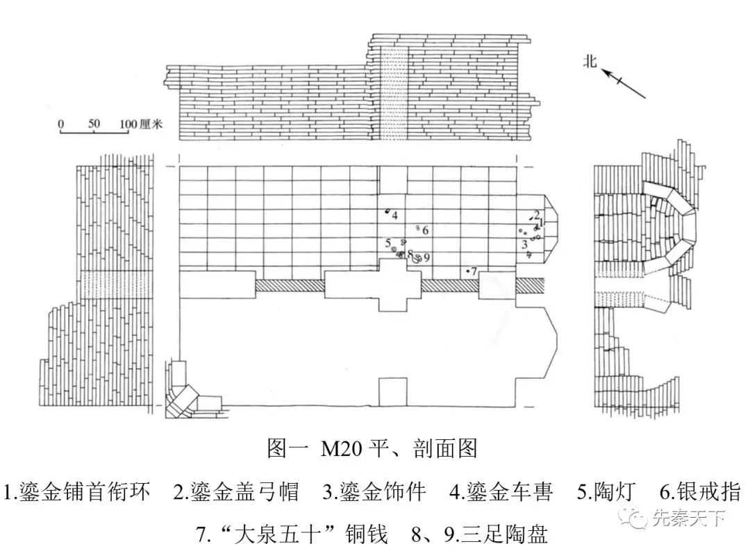 1977年,考古工作者在赫章可樂墓地第三次考古發(fā)掘中清理了磚室墓M20,《赫章可樂發(fā)掘報(bào)告》(下文簡稱《報(bào)告》)僅用“大泉五十”銅錢將M20年代定在新莽時(shí)期。[1]筆者在考察貴州地區(qū)漢代磚室墓時(shí),[2]發(fā)現(xiàn)M20的斷代值得商榷。本文將對M20的墓葬形制和隨葬品進(jìn)行重新梳理,期冀對其年代做出新的判定。