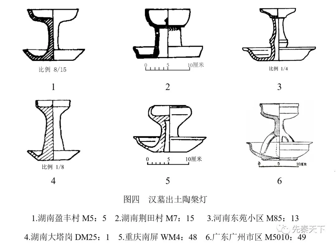 漢代豆形燈由戰(zhàn)國豆形燈發(fā)展而來,且有更豐富的變化。[20]湖南盈豐村M5:5(圖四:1)、[21]湖南荊田村M7:15(圖四:2)、[22]河南東苑小區(qū)M85:13(圖四:3)、[23]湖南大塔崗DM25:1(圖四:4)、[24]重慶南屏WM4:48(圖四:5)、[25]廣東廣州市區(qū)M5010:49(圖四:6)[26]出土的陶槃燈形制均與M20:5(圖三)相近。此外,在江西薛家?guī)X,[27]重慶南屏,[28]廣西大塘城村,[29]湖南砂子塘、[30]赫山廟、[31]濂溪村、[32]茅坪坳、[33]耒陽、[34]楊家山[35]等地皆有此類器物出土,其年代跨度從西漢中期延續(xù)至東漢晚期。這表明陶槃燈作為漢墓的典型隨葬品,使用時(shí)間長、使用地域范圍廣。