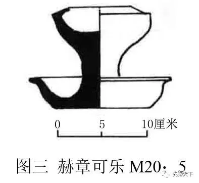 赫章可樂M20出土了1件陶燈(M20:5),斂口,球形腹,短實(shí)柱,托盤為底,口徑8.5、高12.2厘米(圖三)。該陶燈有燈盤,中有短柄燈柱,下有一敞口底盤,應(yīng)為豆形燈中的“槃燈”,亦稱“盤燈”或“承盤燈”。[19]