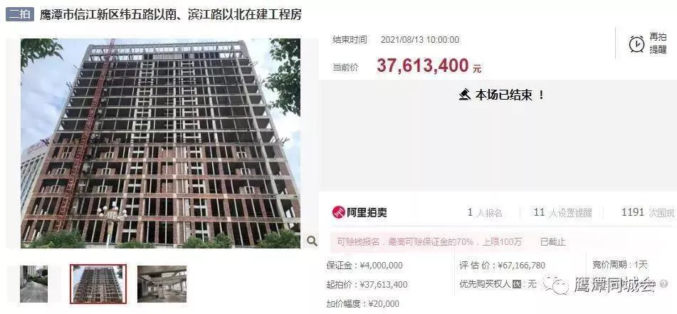 用戶姓名謝志紅通過(guò)競(jìng)買號(hào)N3687于2021年8月13日10:00:00在鷹潭市中級(jí)人民法院于阿里拍賣平臺(tái)開(kāi)展的“鷹潭市信江新區(qū)緯五路以南、濱江路以北在建工程房”項(xiàng)目公開(kāi)競(jìng)價(jià)中,以最高應(yīng)價(jià)勝出,成交價(jià)格為¥37613400(叁仟柒佰陸拾壹萬(wàn)叁仟肆佰元)。