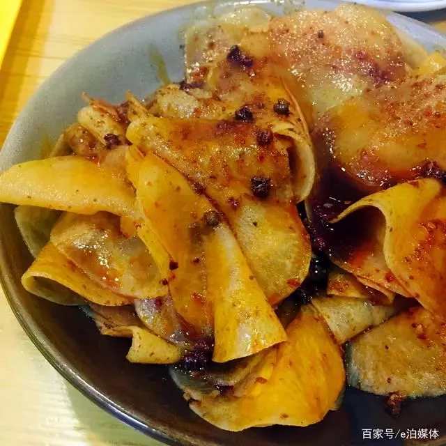 一家店撐起一個(gè)類別?因?yàn)樵跊]有名字的“通渭路洋芋片”開業(yè)之前,這種吃法的洋芋片幾乎找不到了。它基本上是十幾年前中小學(xué)門口賣的零嘴的復(fù)刻版,洋芋片算不上獨(dú)特,但這種吃法比較特別。用很麻辣的調(diào)料煮出來的薄洋芋片、豆皮,又香又辣欲罷不能。