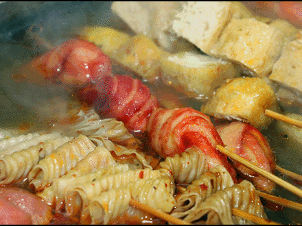 就這樣洋芋片、豆腐皮、平菇就這樣被分區(qū)放入滾燙的水中燙熟
