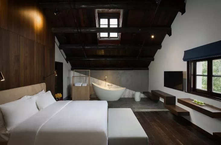 標(biāo)間、大床、小套、家庭和閣樓套房等,錦上云宿共設(shè)置十種房型,并以十位民國時期的先鋒人物為其命名,如張愛玲的傾城圍爐套房,徐志摩的云游大床房,陸小曼的蝶舞大床房,林徽因的四月大床套間,梁思成的營造公館套房......與大宅氣質(zhì)一脈相承。