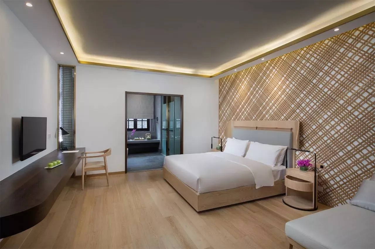 雖沒有繁復(fù)沉重的老舊物件,但若細(xì)看,會發(fā)現(xiàn)每個房間都各有其主題,竹編、剪紙、刺繡,三大中國傳統(tǒng)手工藝以抽象且自然的方式融入到房間之中,典雅的中國風(fēng)元素使寬敞的客房多了一絲獨特韻味。