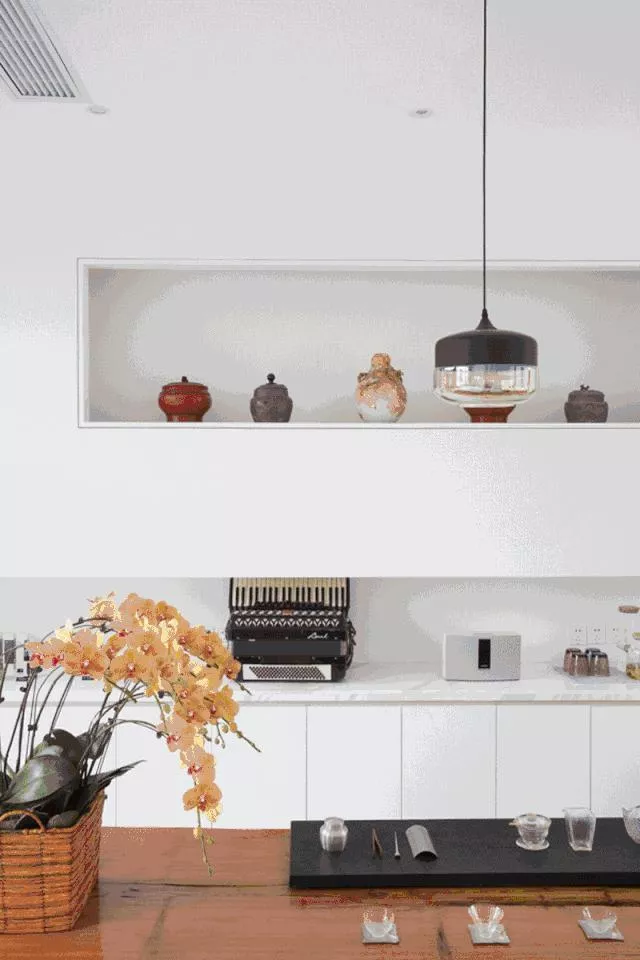 前廳和外觀看上去很協(xié)調(diào),新中式的風(fēng)格,大片極簡的白色的魔力便是能讓人迅速放空,安靜下來。中式的茶幾桌上的幾幅茶具,籠子里跳躍的情人鳥兒,幾件老器物,一只老鐘擺,一架手風(fēng)琴,這些帶著斑駁歲月感的器物預(yù)示著你新的故事。
