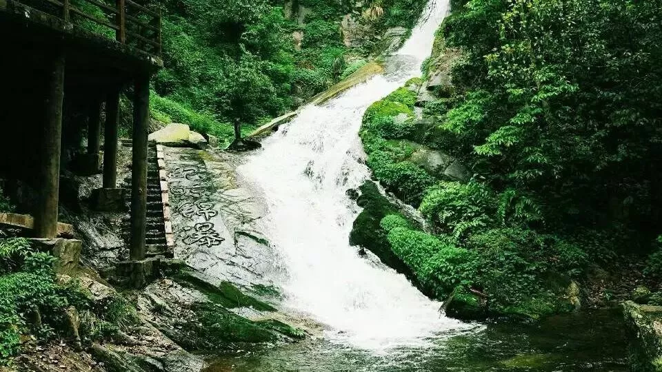 繼續(xù)游覽,曲折的竹籬小橋和“娥皇舞袖瀑”后是陡峭的山路。轉(zhuǎn)過一處蔥郁的山林,眼前豁然開朗,只見寬大的瀑布從山頂傾瀉而下,落譚處濺起陣陣水花,掬起一抹清泉,空氣濕潤清新,微風(fēng)吹拂,愜意極了,這里就是娥皇溪的盡頭了