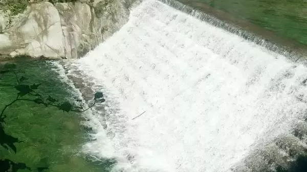將車停在停車坪,步行約五分鐘,首先入眼的是一簾壯觀瀑布,這是由一個巨大的攔河壩截留陽江而成,壩頂高大且幅面寬闊,瀑布潔白亮麗、似錦如緞。瀑布下湖水清澈,青山倒影其中。往前走二十步,有一個約三百米的人工巖石隧道,小車可以進(jìn)入,但里面沒有燈光,不時會有水珠從洞頂?shù)温?。穿過隧道,手機定位居然由永州東安變成了邵陽新寧,再回到這頭,定位又回到了東安,可見這地方便是兩地分界線