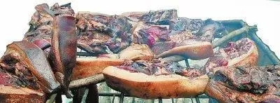 殺了過年豬,大吃一頓是必然的。吃不完的豬肉,就需要碼上鹽掛起來。至今,很多山區(qū)家里有火塘的彝族人家里,都會把臘肉掛在火塘上方,經(jīng)受每天的煙熏火燎,臘肉變得黑而油亮,鹽味浸入到肉中,加上特殊的煙熏味,彝家的臘肉煮出來,連湯都舍不得倒掉,把大顆青菜切好煮進(jìn)去,就是一道熱氣騰騰的美味湯菜。有的地方也會把煮臘肉的湯放入彝族酸菜,調(diào)制成臘肉酸菜湯,再搭配土豆、蕎饃饃,一口滑膩一口酸爽,更加體現(xiàn)臘肉的美味。