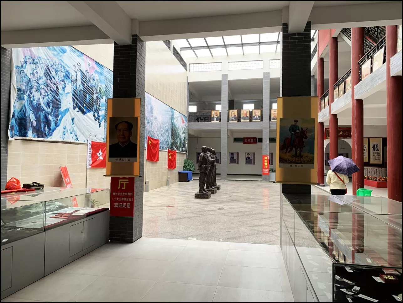 展館中央有三尊立姿雕像,分別為林育英、林育南、林彪(林育蓉),均為中國革命作出了卓越貢獻(xiàn)。其中,林育英、林育南為革命烈士。后面一字排開掛著中國工農(nóng)紅軍軍旗、“八一”軍旗、國旗和黨旗。背景墻上是“過雪山草地”、“飛奪瀘定橋”、“平型關(guān)大捷”等大型裝飾畫。