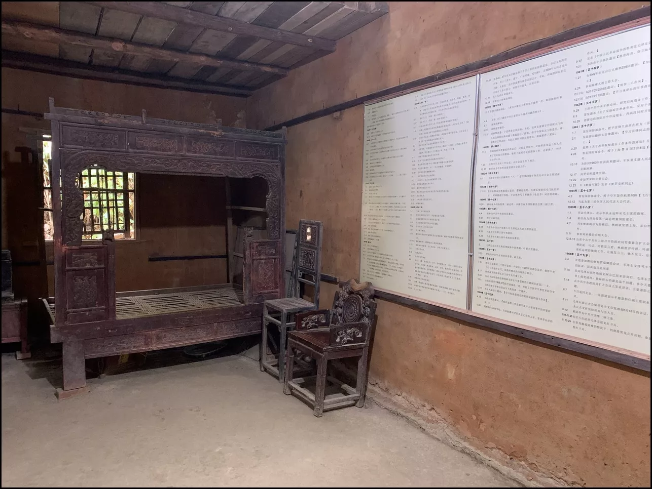 一進(jìn)“帥門”,右邊是出售紀(jì)念品的柜臺(tái),左邊是展覽的簡介,介紹了林彪的家庭情況。穿過屋子中央的天井就是客堂,