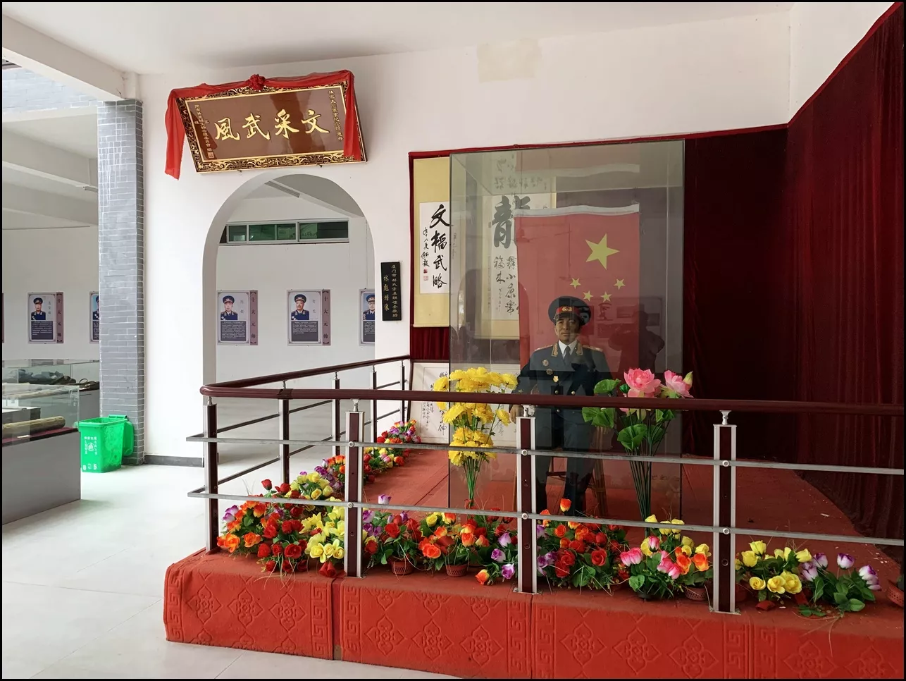 展廳里有十大元帥的照片及簡介,林彪排第三;有“文韜武略”等題詞、條幅、匾額;有林彪著元帥服的坐像,端莊、肅穆,有定力。