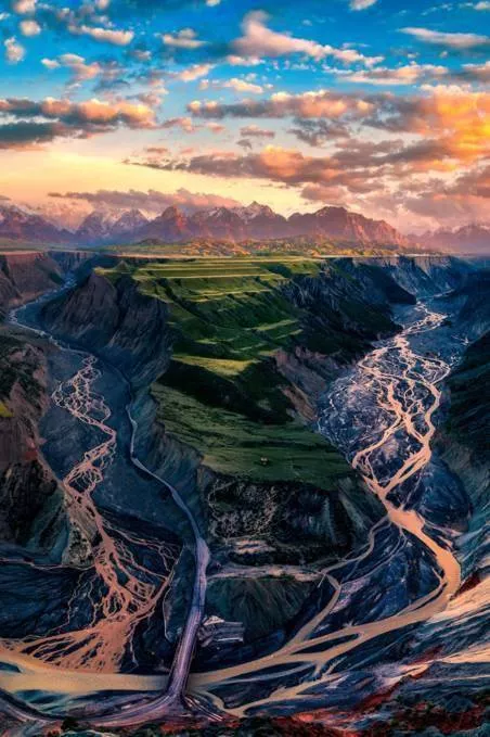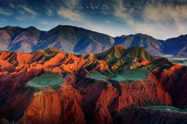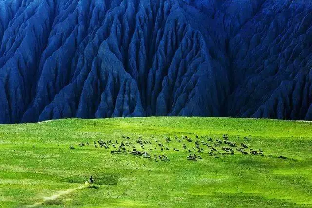一條溝壑縱橫、五彩斑斕的大峽谷,殘陽如血灑在遠(yuǎn)處的天格爾雪峰上,翻滾的烏云下,羊群們埋頭于藍(lán)綠色的草坡之中,整個畫面猶如《魔戒》所描寫的“中土世界”。