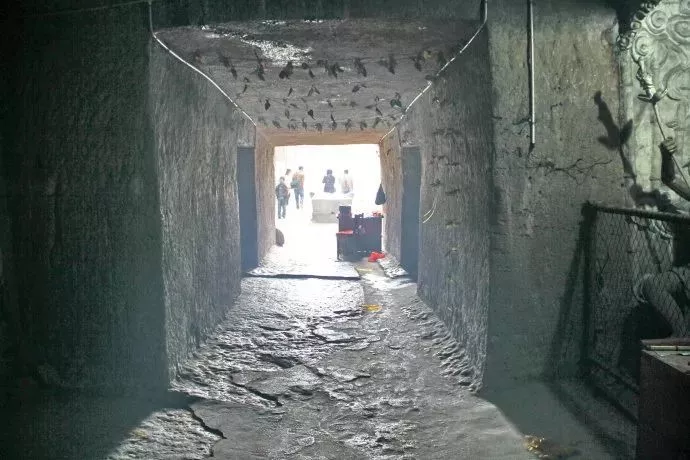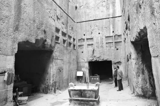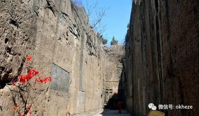 進(jìn)入該墓需經(jīng)過(guò)一段上百米長(zhǎng)的墓道,墓道兩側(cè)為人工開(kāi)鑿出來(lái)的陡直石壁,目測(cè)有二三十米深。