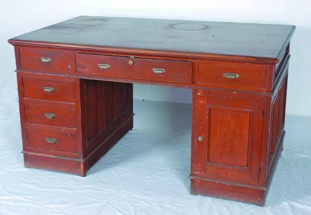 這張棕黃色木質(zhì)辦公桌,是20世紀60年代劉少奇同志在北京中南海福祿居辦公時使用過的。它長152厘米,寬89.2厘米,高81厘米。左邊部分有四個抽屜,中間部分有一個抽屜,右邊部分上面為抽屜,下面為小柜。該辦公桌保存完好,但色彩陳舊,桌面漆皮上有幾處杯底燙痕,桌面右下部(即距桌面右邊邊緣40.2厘米、下邊邊緣40.9厘米的交叉處)有一長1.8厘米、寬3.9厘米的煙頭燙痕。此辦公桌現(xiàn)陳列于劉少奇同志紀念館。2006年11月,經(jīng)湖南文物鑒定專家組確認為國家一級文物。