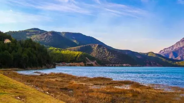 秋天瀘沽湖沿岸由翠綠慢慢變成金黃