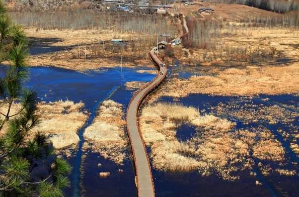 是草海蘆葦叢中延伸出來的一座長達300米的木橋