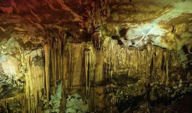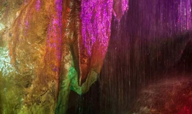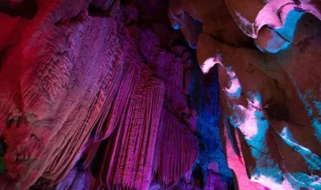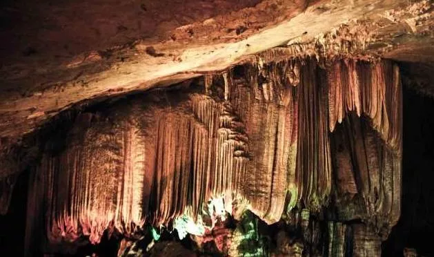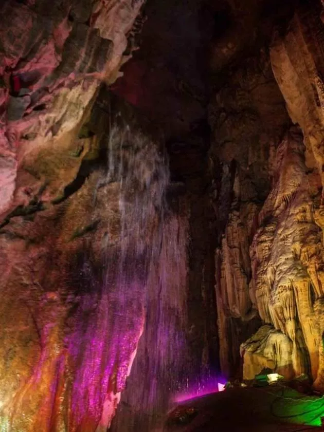 漸漸走入溶洞深處,越來(lái)越大的水聲環(huán)繞在耳邊,聞聲尋去,眼前所見(jiàn)之景讓人贊嘆不已。只見(jiàn)如薄紗般平整鋪開(kāi)的水簾順著巖壁,傾瀉而下,由于燈光的作用,更顯得美輪美奐。這就是著名的地下瀑布景點(diǎn),親眼目睹,果然名不虛傳。