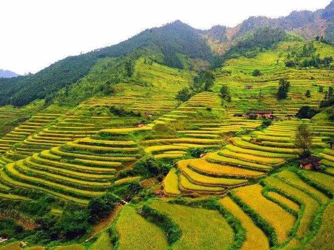 梯田沿著陡峭的山坡層層向上分布,