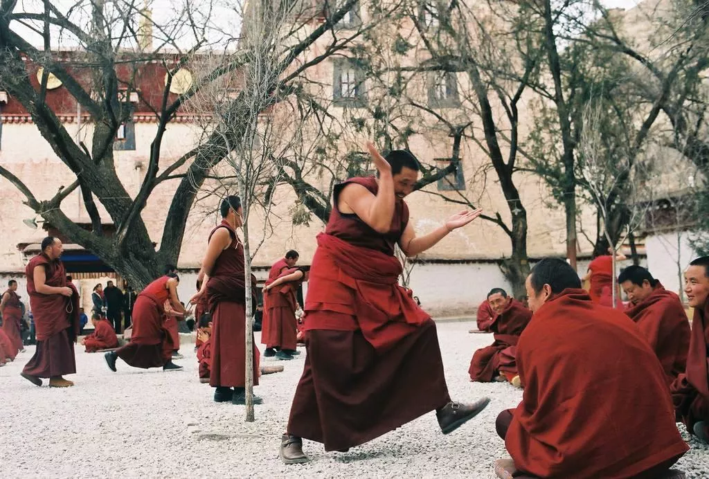 走到了一處寺院,外面已經(jīng)聽見里面的喧囂吵鬧了。邁上臺階,進(jìn)到一個院子里。只見藍(lán)天下的院子里樹木參天,已經(jīng)是秋冬時節(jié),只剩下了枝丫。地上是鋪著的小石子,一大圈身穿紅色僧衣的僧侶們,幾個一組,有坐有站,正在激烈地辯經(jīng)。
