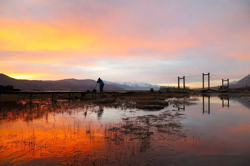 這里是南疆塔什庫爾干縣的一濕地公園,初垂的夜幕讓您還能感受到陽光,晚霞,灰藍的交錯景致,金草灘更是在日落西山之時借此火紅激情綻放了一次,一攝影人正忙于記錄下這嬌嬈的一刻,多想問問他,風景重現(xiàn)給予了他怎樣的創(chuàng)作靈感?