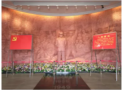 場(chǎng)。雕像下面擺放著簇簇鮮花,兩邊為青松翠柏。在大廳里,