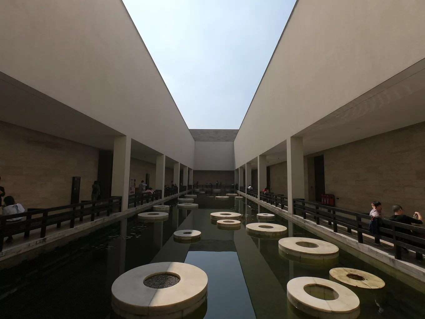 以“一把玉錐散落地面”為設計理念,由不完全平行的四個長條形建筑組成“玉錐”。整個建筑看起來簡約、粗獷、厚重、大氣。行至內庭休息處,實景小池中有玉璧般的圓石,草地邊有標注路標的斜著的玉琮,后來看到垃圾桶也是玉琮樣子的。是我喜歡的中式天井式庭院,可見藍天白云下錦鯉浮游。