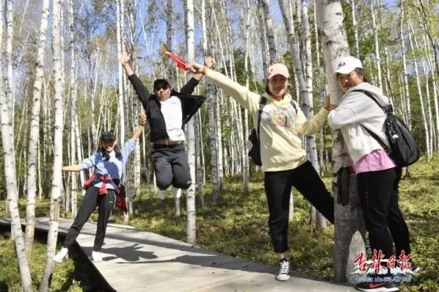 尤其是步行在茂密叢林里的這支隊(duì)伍,用時(shí)將近40分鐘越過寧?kù)o的河谷,走過拱橋,沿著湖邊棧道一路前行,一大片白樺林映入眼簾,一棵棵白樺樹挺拔筆直,如劍戟直指長(zhǎng)天,也有一二株長(zhǎng)成枝椏分叉、樹冠圓闊,展示出白樺樹的另一種風(fēng)姿。游客們?nèi)逡黄鹨园讟鍢錇楸尘?,用相機(jī)或手機(jī)留下自己最美的身影。