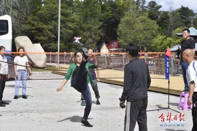 “一組加油!加油!”一聲聲的助威聲,吸引了記者的注意。在碧泉湖岸邊的廣場(chǎng)上,長(zhǎng)白山毽球協(xié)會(huì)正在舉行激烈的毽球比賽,參賽選手們抬腿、跳躍、騰挪、轉(zhuǎn)身,在場(chǎng)地中展示著他們的風(fēng)采。