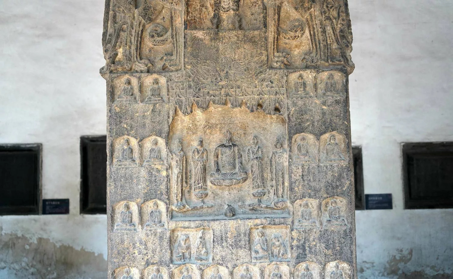 穿過牌坊后可以看到西邊一側(cè)有一段長長的回廊,走進(jìn)去可以看到在這里屹立著20多尊碑文,除了傳統(tǒng)的文字之外,這些碑文上面還有不少浮雕的佛像,看介紹可以知道不少都是漢以后唐之前的遺存。尤其是被列入第一批永久禁止出國(境)的國寶級文物-涅槃變相碑,看到的時(shí)候有些驚喜。