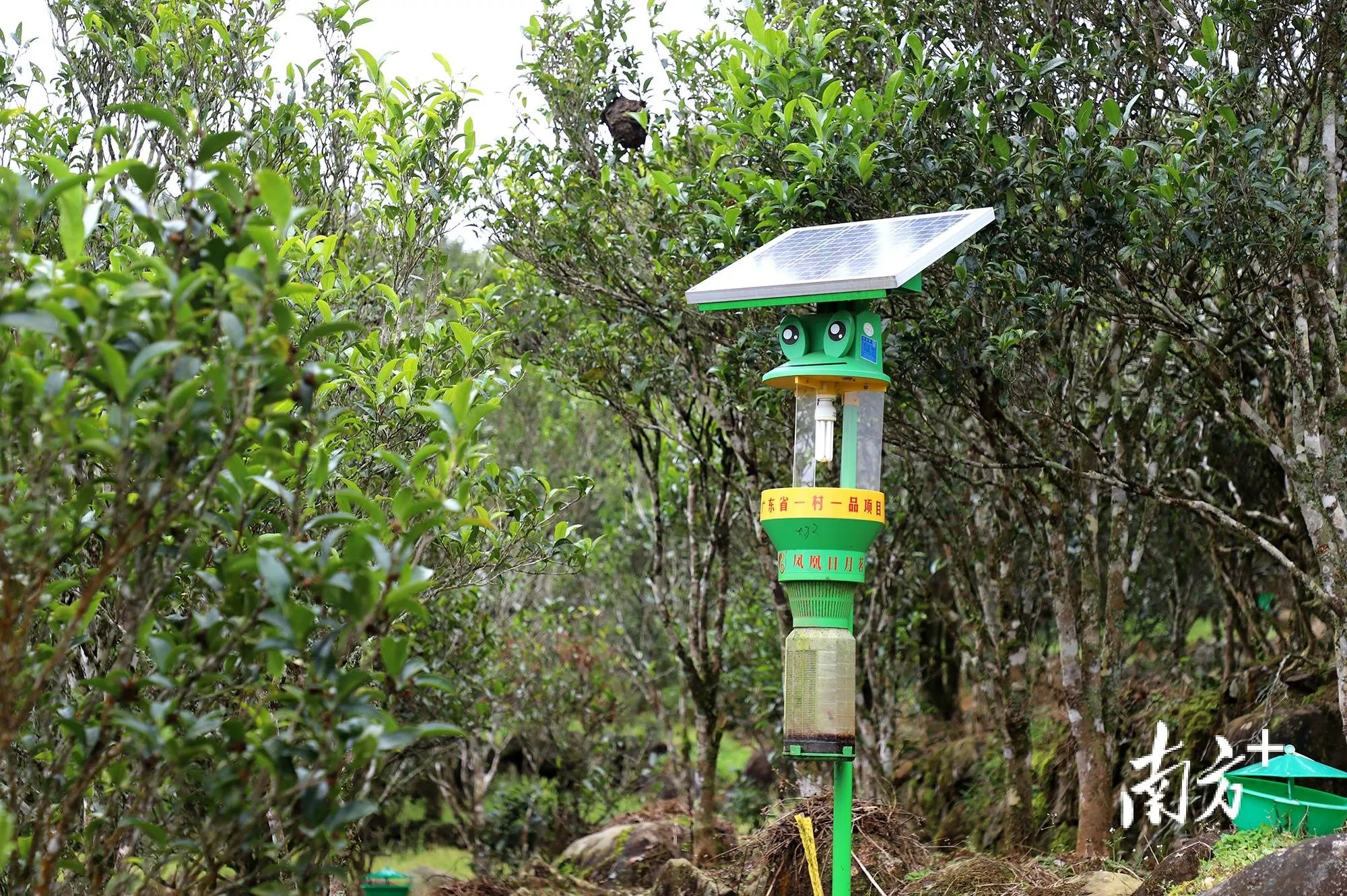 在漫山遍野的茶樹間,還藏有不少“滅蟲武器”——一個個設備像衛(wèi)士一樣“站”在古茶樹旁,一張張粘蟲板星羅棋布分布其間。鳳西村黨支部書記林偉書指著一種青蛙造型的“大家伙”稱,這是“太陽能風力式捕蟲器”,利用害蟲的趨光習性和風扇吸力,誘集害蟲進而滅之。他又指著茶樹叢中一塊塊粘滿蟲子的黃色粘板說:“你看,上面都是吃茶葉的害蟲,它們自投羅網。”林偉書稱,當具有黃色偏愛性的茶樹害蟲看到誘蟲板后,就會飛上去,被蟲膠牢牢粘住。