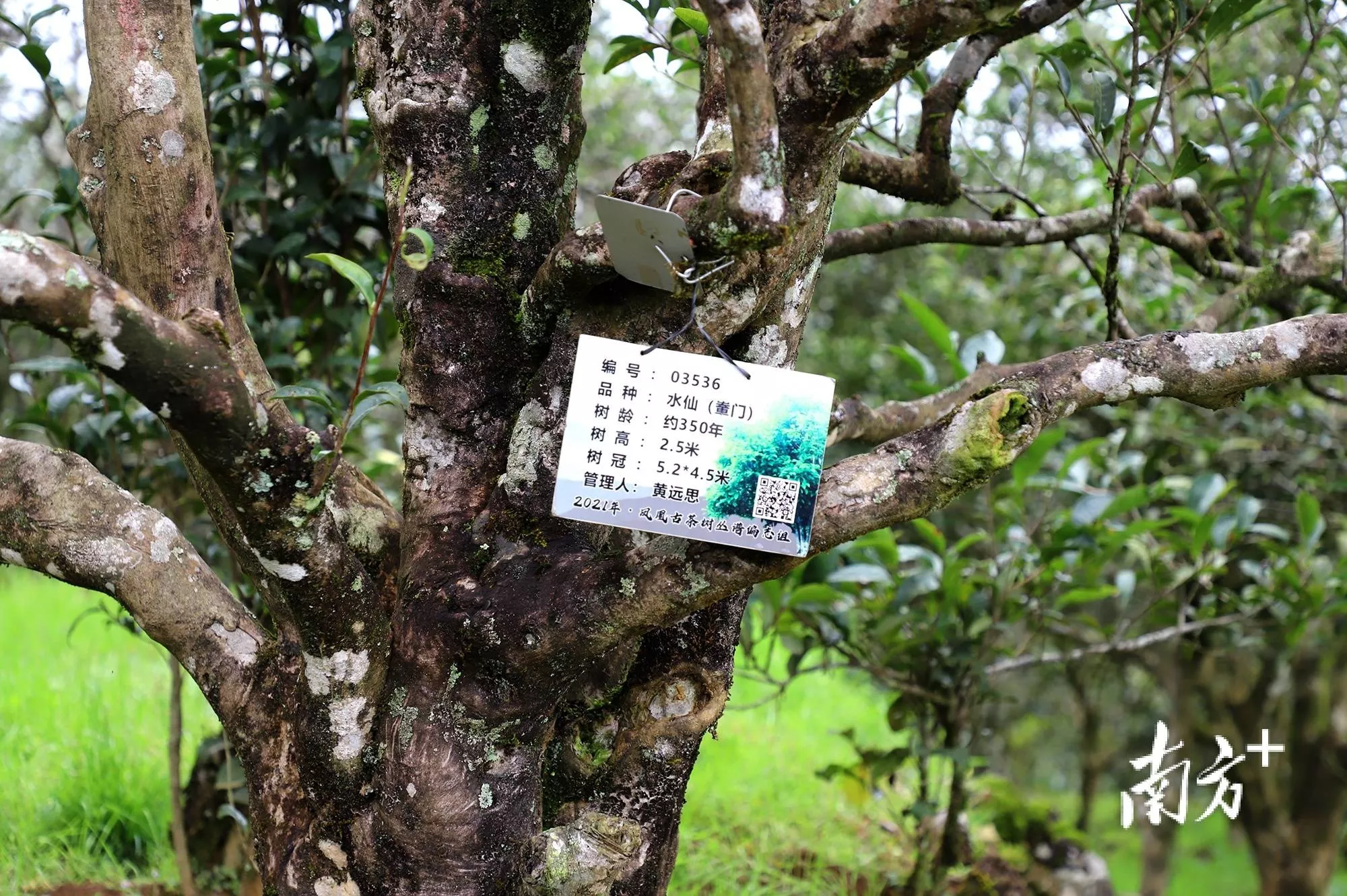 在大庵古茶樹園里,現在樹齡100年以上的古老茶樹4000多株,200年以上的古老茶樹1000多株。園中不少古茶樹身上懸掛著牌子——“編號03536;品種:水仙;樹齡約350年;樹高2.5米;樹冠5.2×4.5米;管理人黃遠思……”樹牌上還附有二維碼,用手機掃一掃,關于此樹的詳細信息就能在“云端”一覽無余。