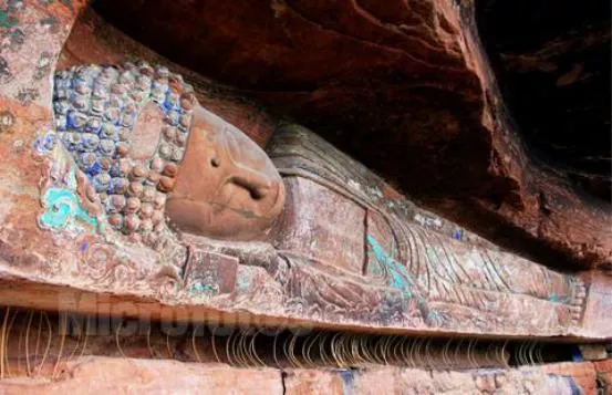 護(hù)國寺西南邊的懸空臥佛雕刻于晚唐時(shí)期,在懸空的崖壁鑿成,雕刻精美,造型大氣。臥佛身著雙領(lǐng)下垂袈裟,憑虛而臥,面容慈和,情態(tài)自然,“一臥千古”。雖然不如大足石刻臥佛之壯觀,但其懸空雕刻成像可堪全國一絕,歷經(jīng)36年硝煙戰(zhàn)火的洗禮,仍然保存完好。臥佛旁雄關(guān)險(xiǎn)道,有千佛崖、三圣巖,崖壁上眾多名人題刻赫然醒目。