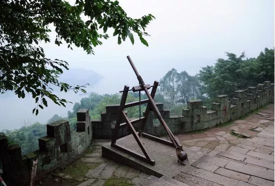 登上天梯,是一處寬闊的平臺,這些鍋狀的凹坑叫做九口鍋,是當(dāng)年釣魚城守軍碾磨硝、磺、木碳,用以配制火藥的碾盤,這是中國最早的兵工廠遺址。制造鐵雷、火炮等威力巨大的殺傷性武器,有效地增強(qiáng)了釣魚城的整體防御能力。