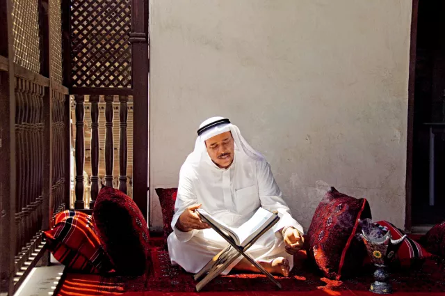 ◎ 吉達(dá),清真寺,一位阿拉伯男人正在閱讀《古蘭經(jīng)》。由于坐落于紅海東岸,吉達(dá)在把貨物運(yùn)往麥加的同時(shí),也成為由海路前往麥加的穆斯林朝圣者的門戶。