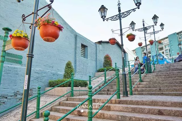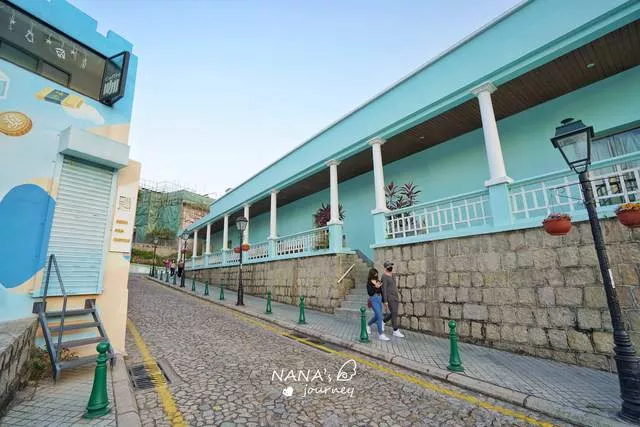 這一片葡式建筑離氹仔的豪華酒店區(qū)很近,就在銀河的對面進(jìn)入,走過官也街,沿著石板路走上坡,不一會(huì)就能見到薄荷色的建筑群,非常的歐洲風(fēng)味,游客都留在這里開拍起來。