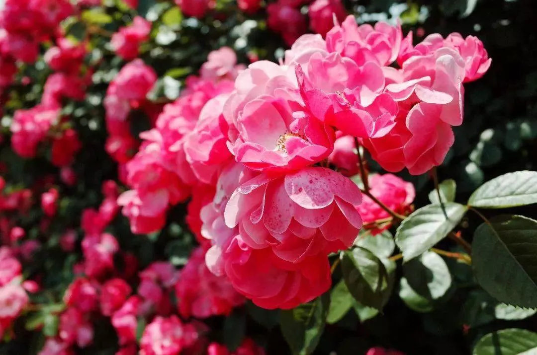 玫瑰盛開的季節(jié),深綠色的枝葉間