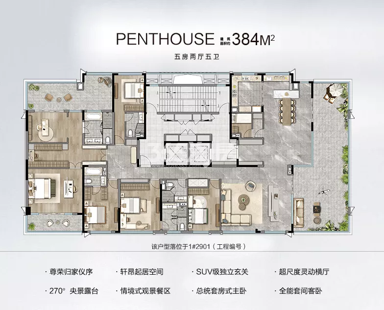 項(xiàng)目規(guī)劃打造9棟住宅,戶型建筑面積為142㎡、193㎡為三房設(shè)計(jì),242㎡為四房設(shè)計(jì),還有325㎡四房?jī)蓮d四衛(wèi)和384㎡五房?jī)蓮d五衛(wèi)設(shè)計(jì)的大平層戶型。