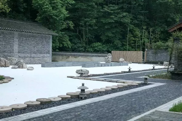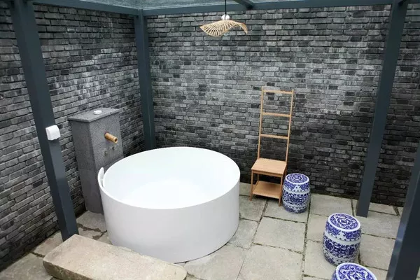 在莊園見山精舍里,有園主精心打造的一處日本禪意枯山水景,四周是一片竹林,這里分別有6套溫泉別苑。四周青磚白瓦,竹編小燈懸掛于玻璃天頂之下,埋進(jìn)圓形的浴缸里,水光盈盈,與頭頂?shù)臒艄饨幌噍x映。每個別苑的老門上有一個投影燈,墻上的“隱真”二字清晰可見。