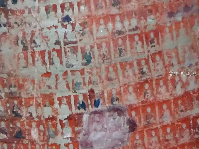 在大佛背后的墻上,還有近5000尊小佛像,每尊大約10厘米高,都是坐姿坐在蓮花寶座上,排列有序,不過因?yàn)槟甏呀?jīng)相當(dāng)久遠(yuǎn),這些小佛像被風(fēng)化得比較嚴(yán)重,基本都只能看出大致的輪廓。