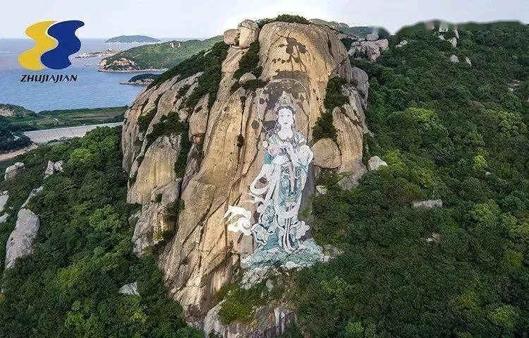 白山以奇石異縫聞名,站在山峰的巨石上可遠(yuǎn)眺普陀山海域景色。尤為著名的是高114.9米的干丈崖上彩繪的一尊觀音大士像壁畫(huà)高69米,被譽(yù)為“海上莫高窟”。