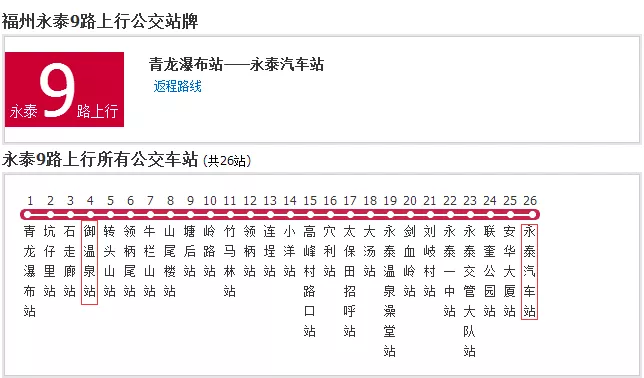 A、在福州西客站或福州汽車北站坐班車至永泰(車費14—18元/人),到達永泰后汽車站后,可乘坐9路公交到御溫泉站下車。