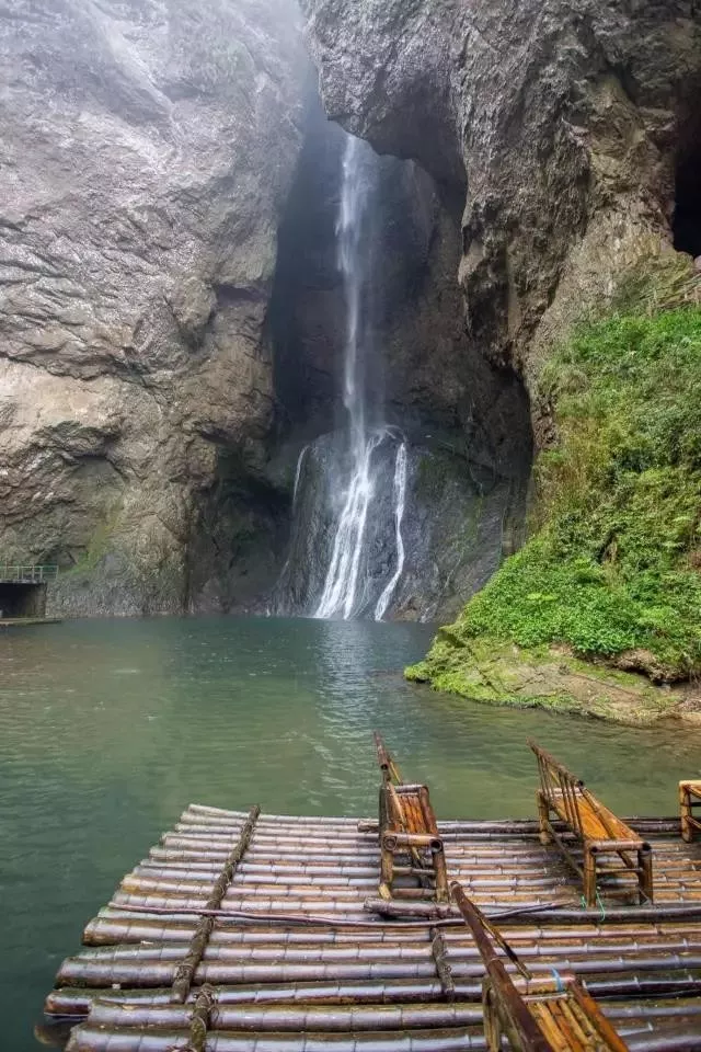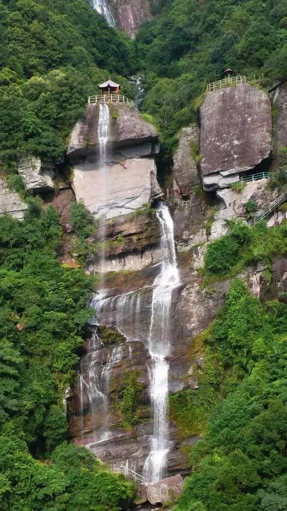 九天瀑布沿588米青崖石壁飛流而下,空谷轟鳴,氣勢恢弘。珠霧飄蕩,折射出四道彩虹,倒映在潭水中,絢麗奪目。