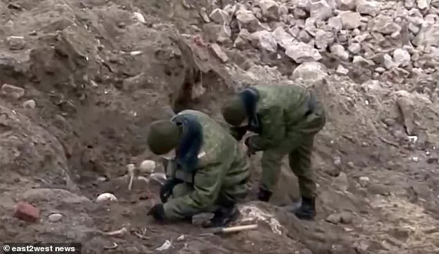 白俄羅斯士兵在萬人坑墳?zāi)股掀D苦地開展清理工作時掃除殘骸污垢